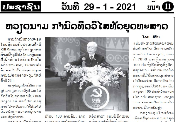 ໜັງສືພິມ ປະຊາຊົນ ຂອງລາວ, ສຽງຂອງພັກປະຊາຊົນປະຕິວັດລາວ, ສະບັບອອກວັນທີ 29 ມັງກອນ ໄດ້ມີບົດຂຽນດ້ວຍຫົວຂໍ້ວ່າ “ຫວຽດນາມ ກຳນົດທິດວິໄສທັດຍຸດທະສາດ”. ບົດຂຽນໄດ້ຊີ້ແຈ້ງວ່າ ກອງປະຊຸມໃຫຍ່ຜູ້ແທນທົ່ວປະເທດຄັ້ງທີ 13 ຂອງພັກກອມມູນິດຫວຽດນາມ ຈະສ້າງພືຶ້ນຖານສຳຄັນໃນຍຸດທະສາດສ້າງສາປະເທດຊາດຢ່າງໄວ, ຍາວນານ ແລະ ໝັ້ນຄົງຂອງຫວຽດນາມ. ໜັງສື່ພິມກໍ່ຄັດສະເໜີຄຳເວົ້າທີ່ວ່າ: “ບໍ່ມີເວລາໃດທີ່ປະເທດຫວຽດນາມ ມີຂອບຂະໜາດ, ຄວາມສາມາດບົ່ມຊ້ອນ, ອິດທິພົນຊື່ສຽງ, ທີ່ຕັ້ງບົດບາດຄືໃນທຸກວັນນີ້” ຂອງທ່ານເລຂາທິການໃຫຍ່ ຫງວຽນຝູຈ້ອງ ທີ່ເວລະໄຂກອງປະຊຸມໃຫຍ່ຄັ້ງທີ 13 ຂອງພັກກອມມູນິດຫວຽດນາມ, ຢືນຢັນວ່າ, ຄຳກ່າວປາໄສດັ່ງກ່າວຂອງການນຳພັກ, ລັດ ຫວຽດນາມ ຈະສືບຕໍ່ສ້າງຄວາມເອກອ້າງທະນົງໃຈ, ຄວາມໄວ້ເນື້ອເຊື່ອໃຈ, ຄວາມຫວັງຂອງທົ່ວປວງຊົນກ່ຽວກັບເສັ້ນທາງກ້າວຂຶ້ນຂອງຫວຽດນາມ.