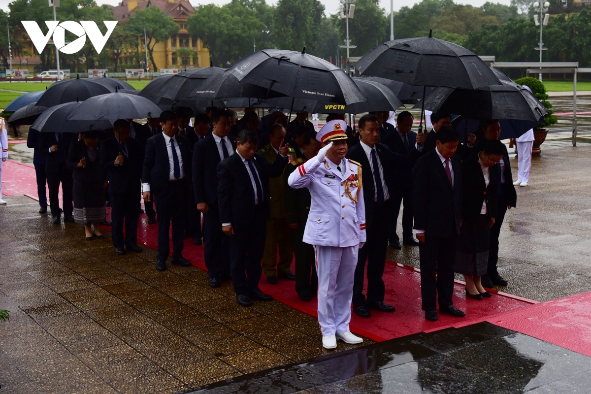 ຫຼັງຈາກນັ້ນ, ທ່ານເລຂາທິການໃຫຍ່, ປະທານປະເທດ ລາວ ທອງລຸນ ສີສຸລິດ ແລະ ພັນລະຍາ ພ້ອມກັບຄະນະຜູ້ແທນຂັ້ນສູງພັກ, ລັດ ລາວໄດ້ໄປວາງພວງມາລາ, ອາໄລຫາບັນດານັກຮົບວິລະຊົນເສຍສະຫຼະຊີວິດເພື່ອຊາດ ຢູ່ເຂດອານຸສາວະລີບັນດານັກຮົບວິລະຊົນເສຍສະຫຼະຊີວິດເພື່ອຊາດ. ພວງມາລາຂອງຄະນະມີແຖວໜັງສືຂຽນວ່າ: ຈົດຈຳວິລະກຳຂອງບັນດານັກຮົບປະຕິວັດ ຫວຽດນາມ ໄປຊົ່ວກາລະນານ.