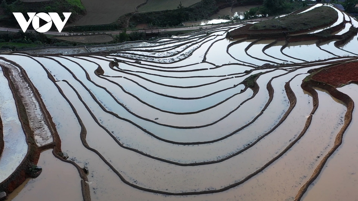 ລະດູນ້ຳຖ້ວມເລີ່ມແຕ່ຕົ້ນເດືອນ ພຶດສະພາ ຫາ ຕົ້ນເດືອນ ມິຖຸນາ ຂະນະທີ່ໄດ້ເລີ່ມເກີດຝົນຕົກໜັກ ພໍ່ແມ່ພີ່ນ້ອງເຜົ່າມົ້ງໄດ້ເລີ່ມນຳເອົານ້ຳຈາກພູສູງມາສູ່ນາຂັ້ນໄດ ເພື່ອກະກຽມໃຫ້ແກ່ລະດູການຜະລິດໃໝ່. ນ້ຳໄດ້ໄຫຼຜ່ານແຕ່ລະເນື້ອທີ່ນາຂັ້ນໄດ ອັນໄດ້ສ້າງເປັນທັດຊະນີຍະພາບທີ່ງົດງາມເປັນໜ້າປະທັບໃຈ ເຮັດໃຫ້ຜູ້ຄົນທັງຫຼາຍຫຼົງໄຫຼ. ອ້າຍ ທ່າວອາເກີ໊ ຢູ່ເມືອງ ໝູ່ກັງຈ໋າຍ ໃຫ້ຮູ້ວ່າ: ພາຍຫຼັງຜັກຜ່ອນເປັນເວລາສາມເດືອນ ອ້າຍໄດ້ເລີ່ມໄຖນາ ແລະ ນຳເອົານ້ຳມາສູ່ ເນື້ອທີ່ ນາຂັ້ນໄດຂອງຄອບຄົວຕົນ. ອ້າຍ ທ່າວອາເກີ໊ ເວົ້າວ່າ: