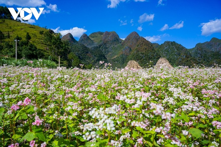ໃນລະດູໃບໄມ້ຫຼົ່ນ, ຢູ່ລຽບຕາມເສັ້ນທາງໄປເຂດພູພຽງຫີນ ດົ່ງວັນ (ແຂວງ ຮ່າຢາງ), ແຂກທ່ອງທ່ຽວສາມາດໄດ້ຮັບຊົມດອກບັກຫວິດ ເຕັມທົ່ວບໍລິເວນ (ພາບ: VOV)