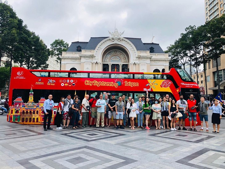 | ແຂກທ່ອງທ່ຽວຕ່າງປະເທດມັກຖ່າຍຮູບຢູ່ໜ້າປະຕູໂຂງໂຮງລະຄອນນະຄອນໂຮ່ຈີມິນ ເມື່ອຂີ່ລົດ bus ສອງຊັ້ນຢ້ຽມຊົມທິວທັດນະຄອນ. |