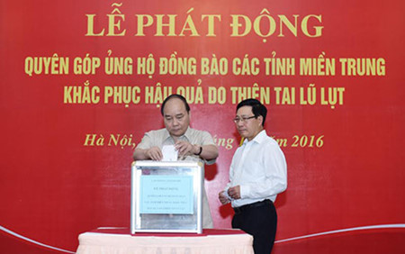 (vovworld) - ຕອນເຊົ້າວັນທີ 18/10 ຢູ່ ຮ່າໂນ້ຍ, ທ່ານນາຍົກລັດຖະມົນຕີ ຫວຽດນາມ ຫງວຽນຊວນຟຸກ ປຸກລະດົມການບໍລິຈາກສະໜັບສະໜູນພໍ່ແມ່ປະຊາຊົນບັນດາແຂວງພາກກາງ, ທ່ານນາຍົກລັດຖະມົນຕີ ຫງວຽນຊວນຟຸກ ຊີ້ແຈ້ງວ່າ ໃນຊຸມວັນຜ່ານມາ, ພະຍຸນ້ຳແກ່ງໄດ້ກໍ່ຄວາມເສຍຫາຍຢ່າງໜັກໜ່ວງກ່ຽວກັບຄົນ ແລະ ຊັບສິນຂອງພໍ່ແມ່ປະຊາຊົນພາກກາງ. ທ່ານນາຍົກລັດຖະມົນຕີ ຫງວຽນຊວນຟຸກ ຮຽກຮ້ອງບັນດາອົງການ, ສ່ວມບຸກຄົນສະໜັບສະໜູນພໍ່ແມ່ປະຊາຊົນພາກກາງທີ່ຖືກເສຍຫາຍຢ່າງ ໜັກໜ່ວງຈາກພະຍຸນ້ຳແກ່ງ. ທ່ານນາຍົກລັດຖະມົນຕີ ຫງວຽນຊວນຟຸກ ສະເໜີວ່າ: