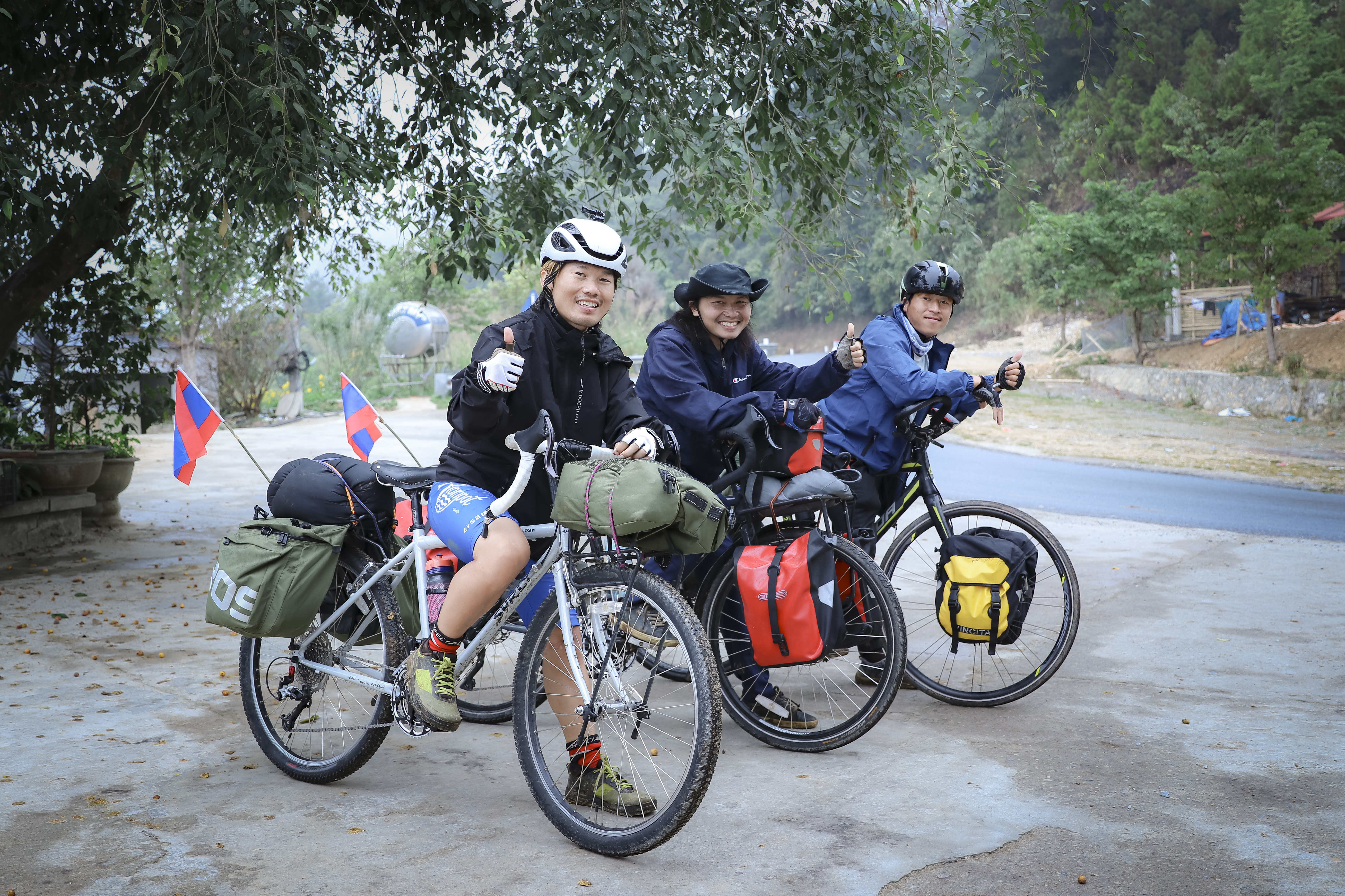 ເຮີວາງ (ຜູ້ຢູ່ໃຈກາງ) ກັບໝູ່ສອງຄົນ ພວມທ່ຽວຊົມຄົ້ນຫາ ແຂວງ ເຊີນລາ ຫວຽດນາມ |
