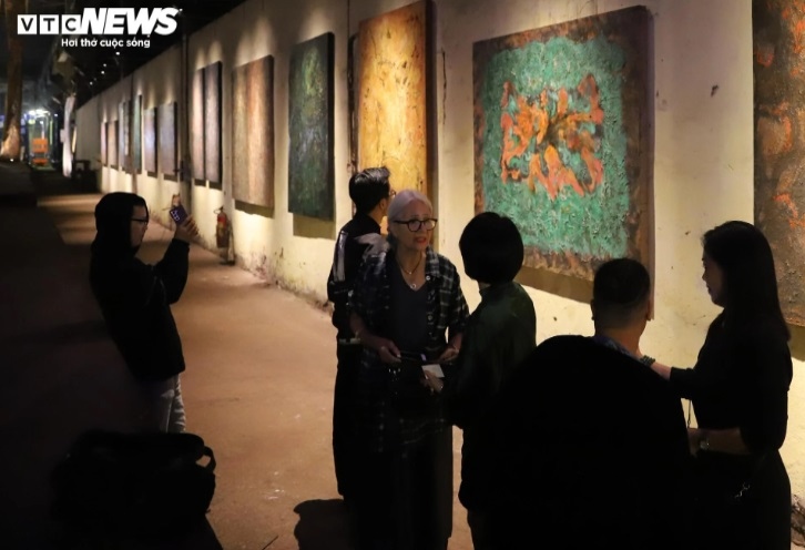 An installation art exhibition titled "The Call" by artist Thu Tran features 40m - 60m long strips of paintings hung across the ceiling. (Photo: VTC News)