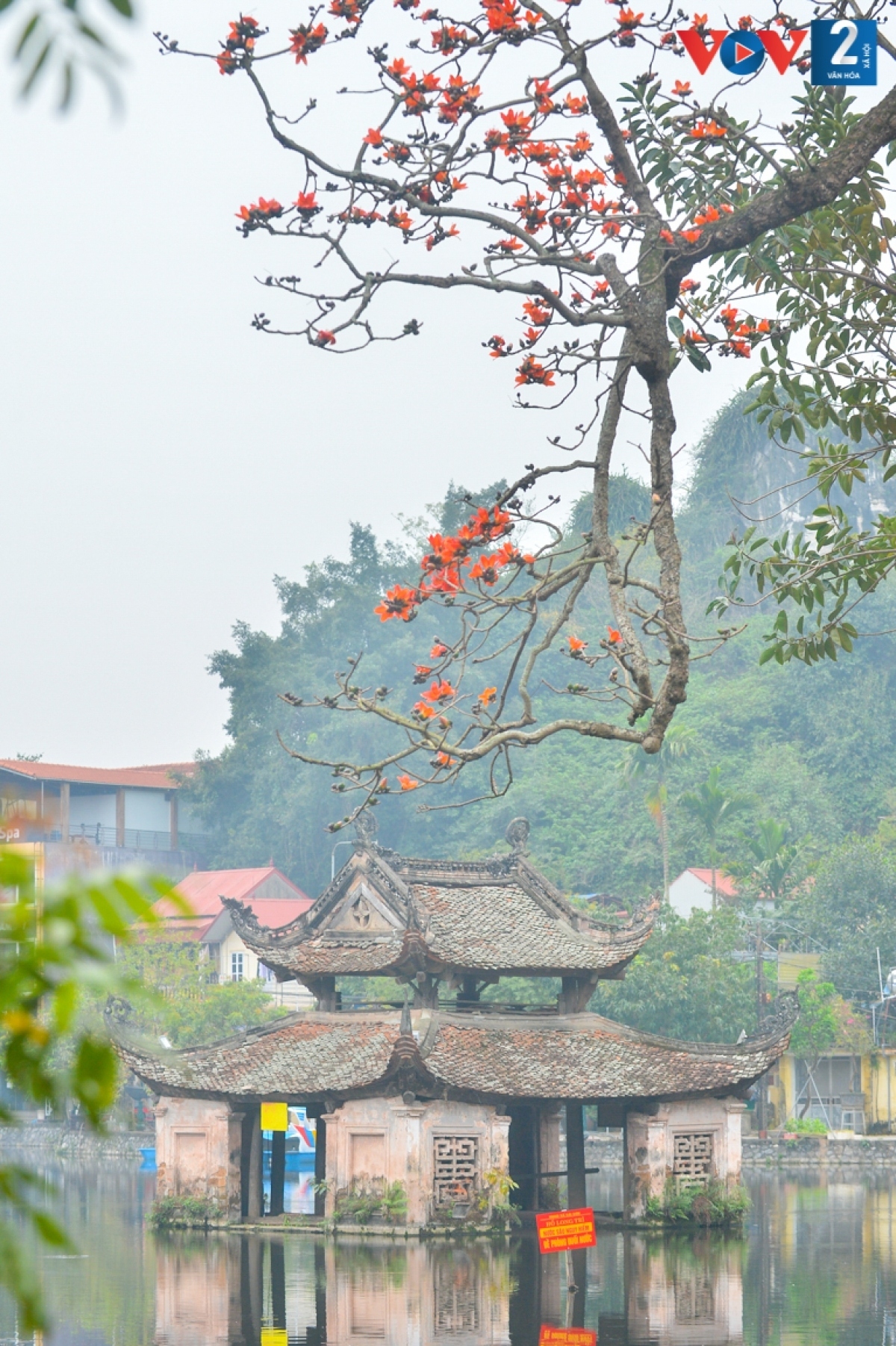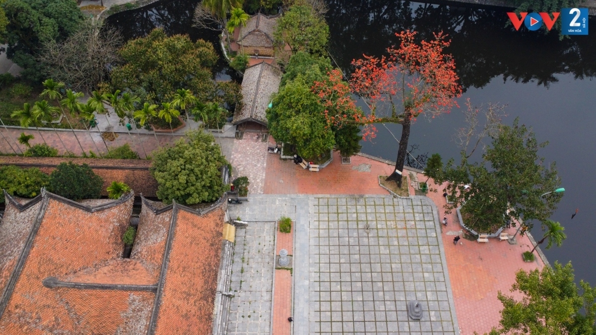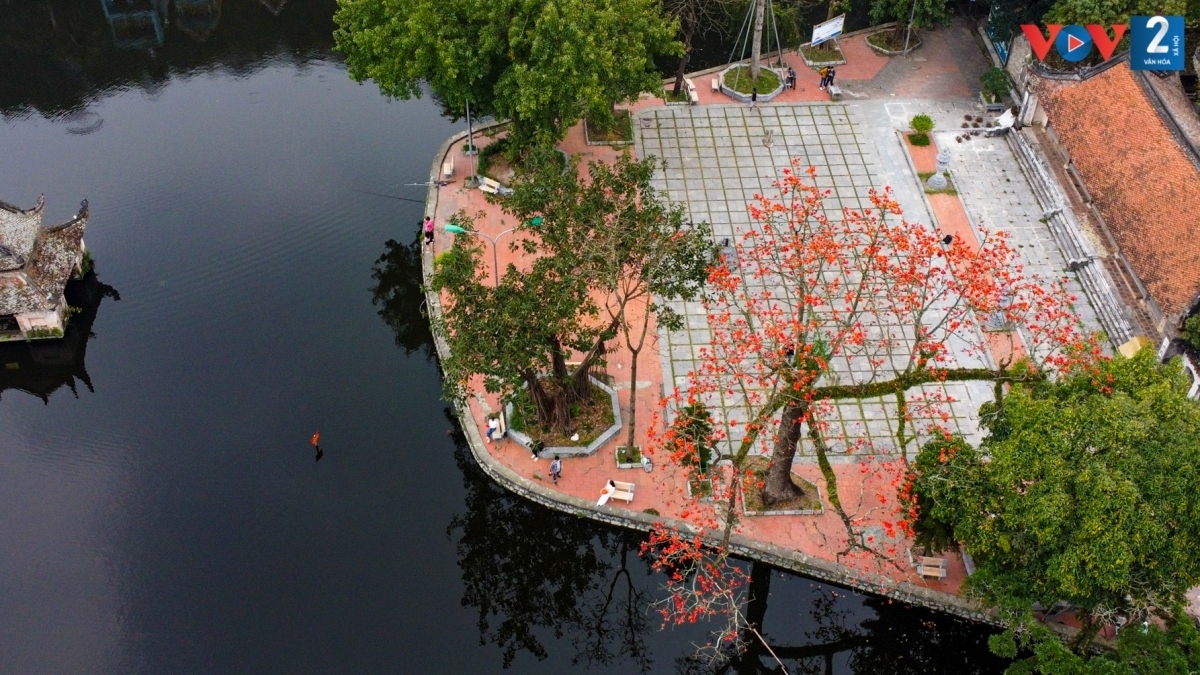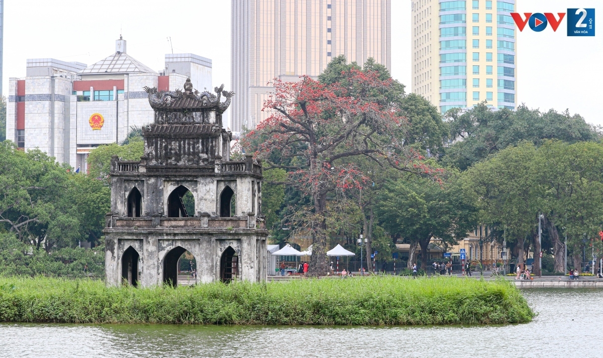 The bright red blossoms on high bare branches offer a postcard scene of Ho Guom (Sword Lake), Hanoi. |