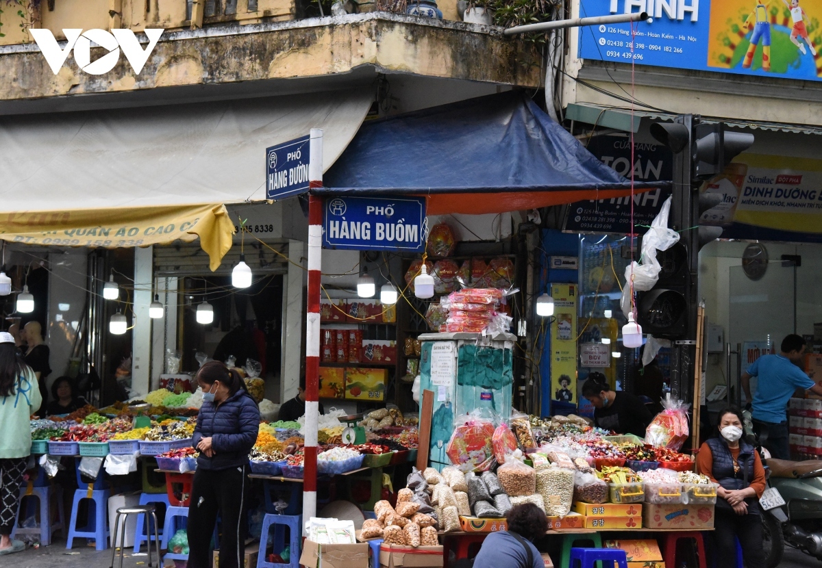 Stalls on Hang Buom street sell both salted and sugared dried fruits, imported candies, and Tet jam.
