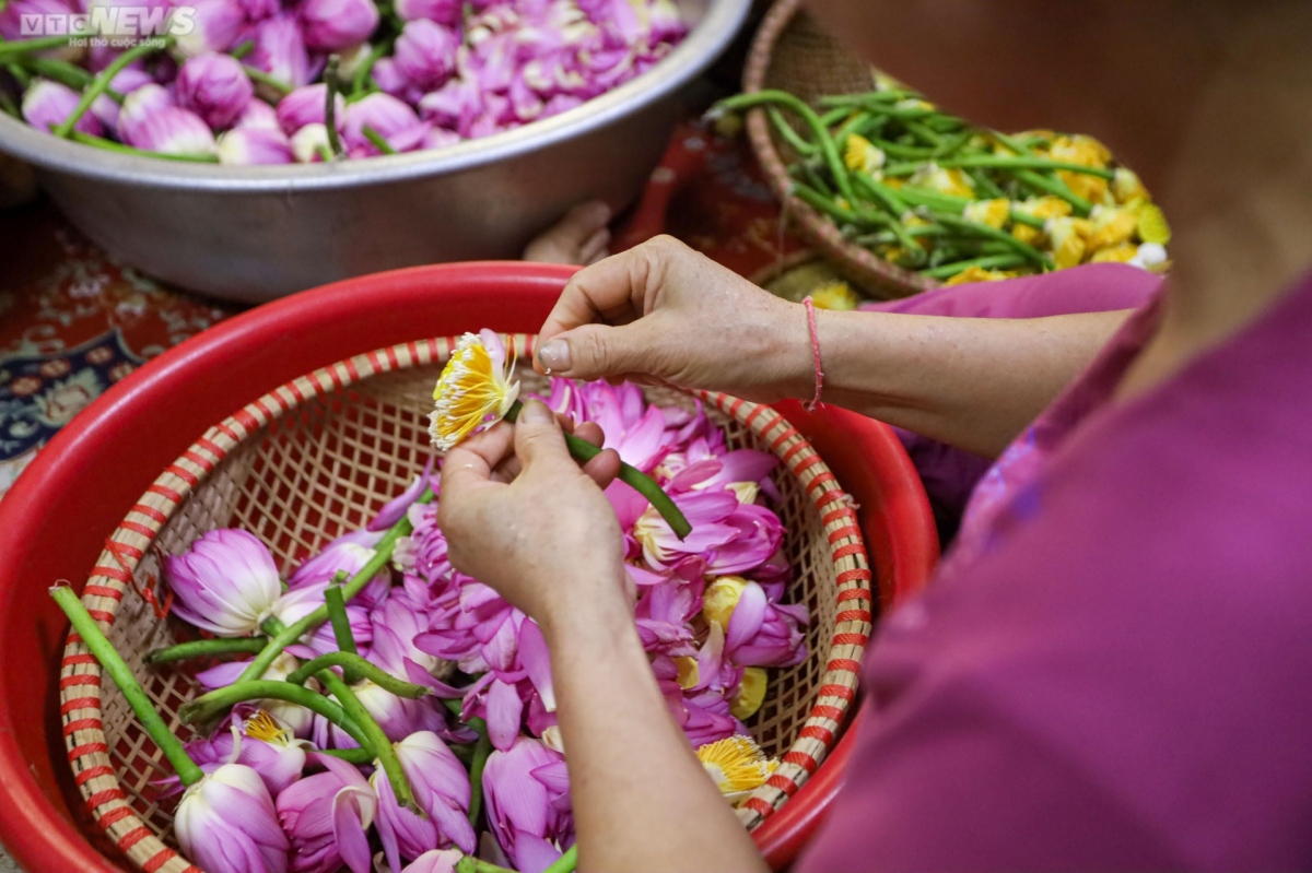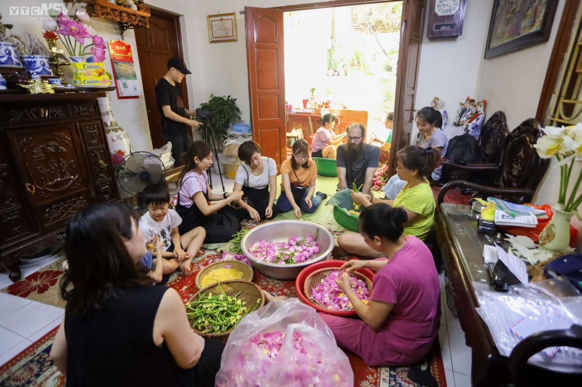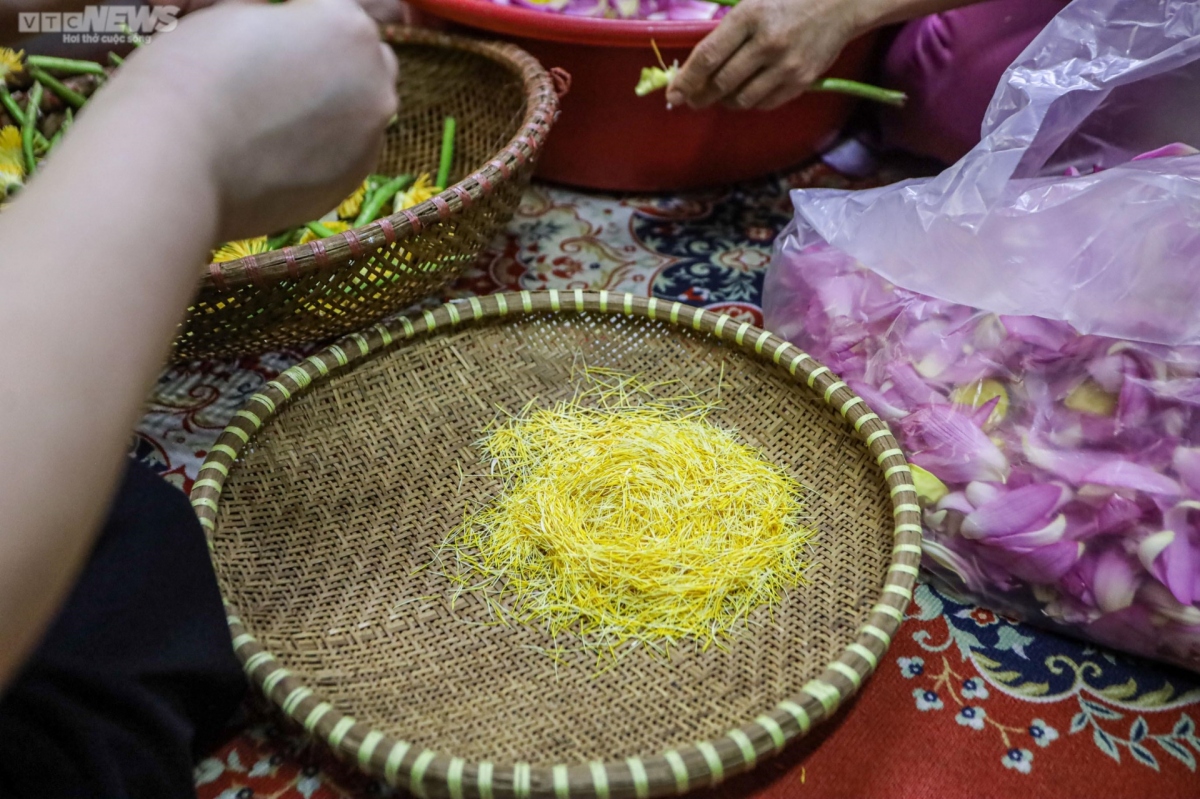 Artisan Nguyen Thi Dan, her family and workers gather to peel off the petals to get the lotus anther as fast as possible.