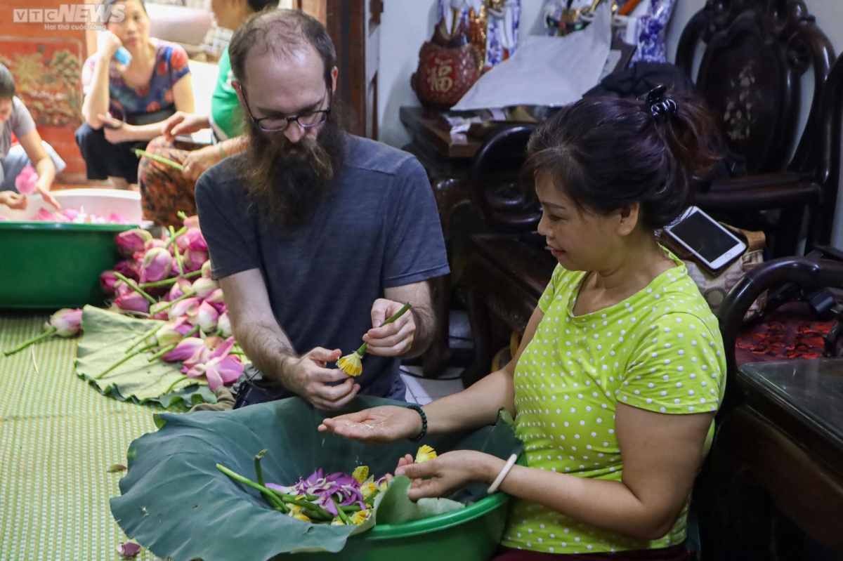 US tourist Seth Griffin shares that he is impressed by meticulous process of making lotus tea.