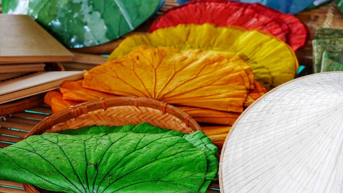 Bags, fans, and conical hats made from lotus leaves are put on show. |