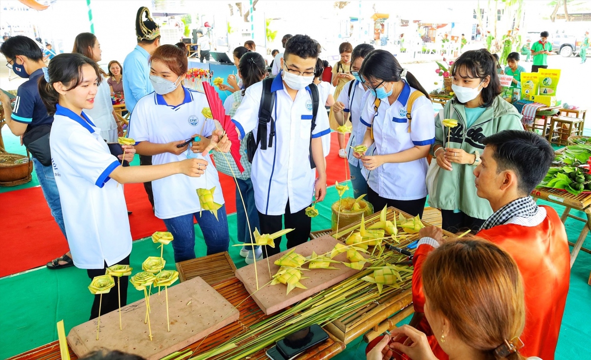 Visitors can join various activities such as making betel leaves and areca wedges, drawing on Ao Dai, tying toys using coconut leaves, and wrapping cakes with leaves. |