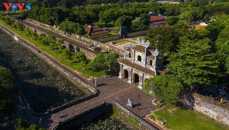 | Tourists are encouraged to drop by Hue Imperial City and explore the tombs of Nguyen Dynasty kings and towering, ancient pagodas. (An aerial view of Hue citadel.) |