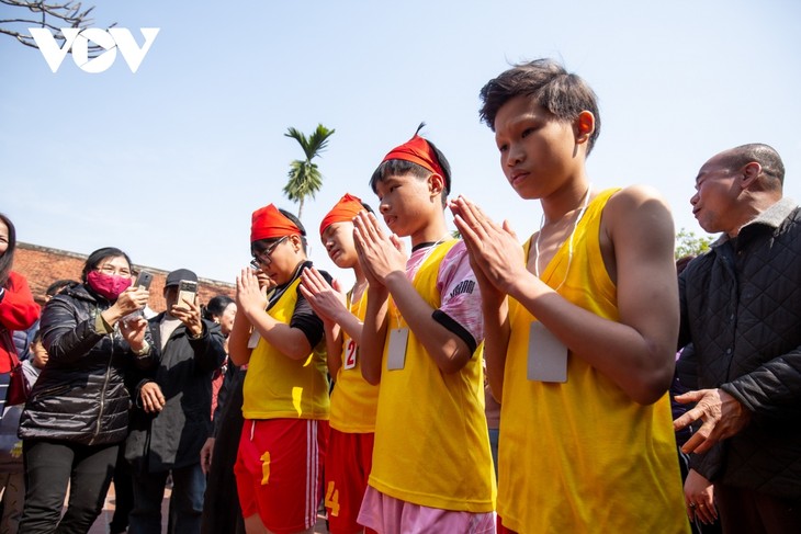 The village's courtyard is packed. The rice cooking contest has three phases: Fire making, water collecting, and rice cooking. Children from 12-14 participate in a 700m marathon from the village's courtyard to its north to collect water. Whoever brings water back to the courtyard first wins. (Photo: Tuan Anh/VOV)
