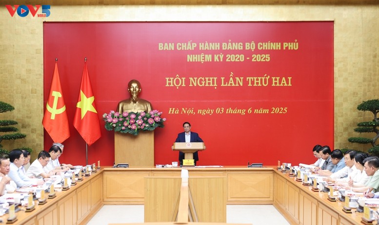 Politburo member, Secretary of the Government's Party Committee, and Prime Minister Pham Minh Chinh addresses the meeting (Photo: Lai Hoa/VOV) |