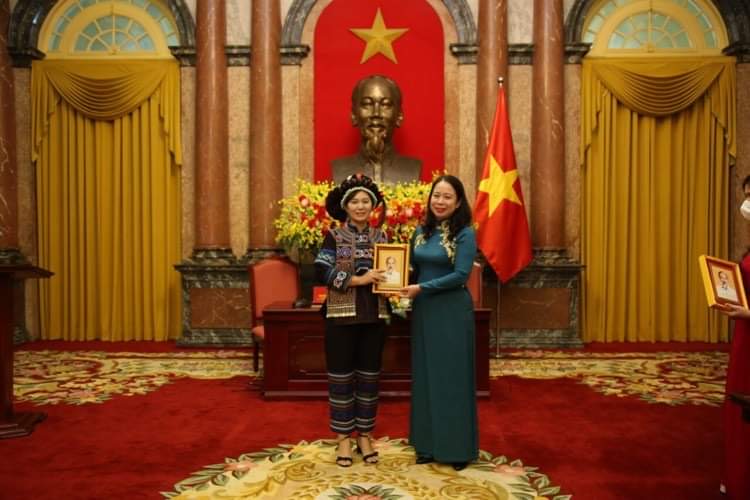 Trang Tho Phe (L) receives a gift from Vice State President Vo Thi Anh Xuan. |