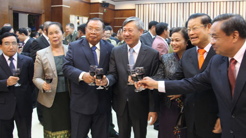 | Посол Вьетнама в Лаосе Нгуен Мань Хунг и руководители Лаоса на церемонии. Фото: nhandan.com.vn |