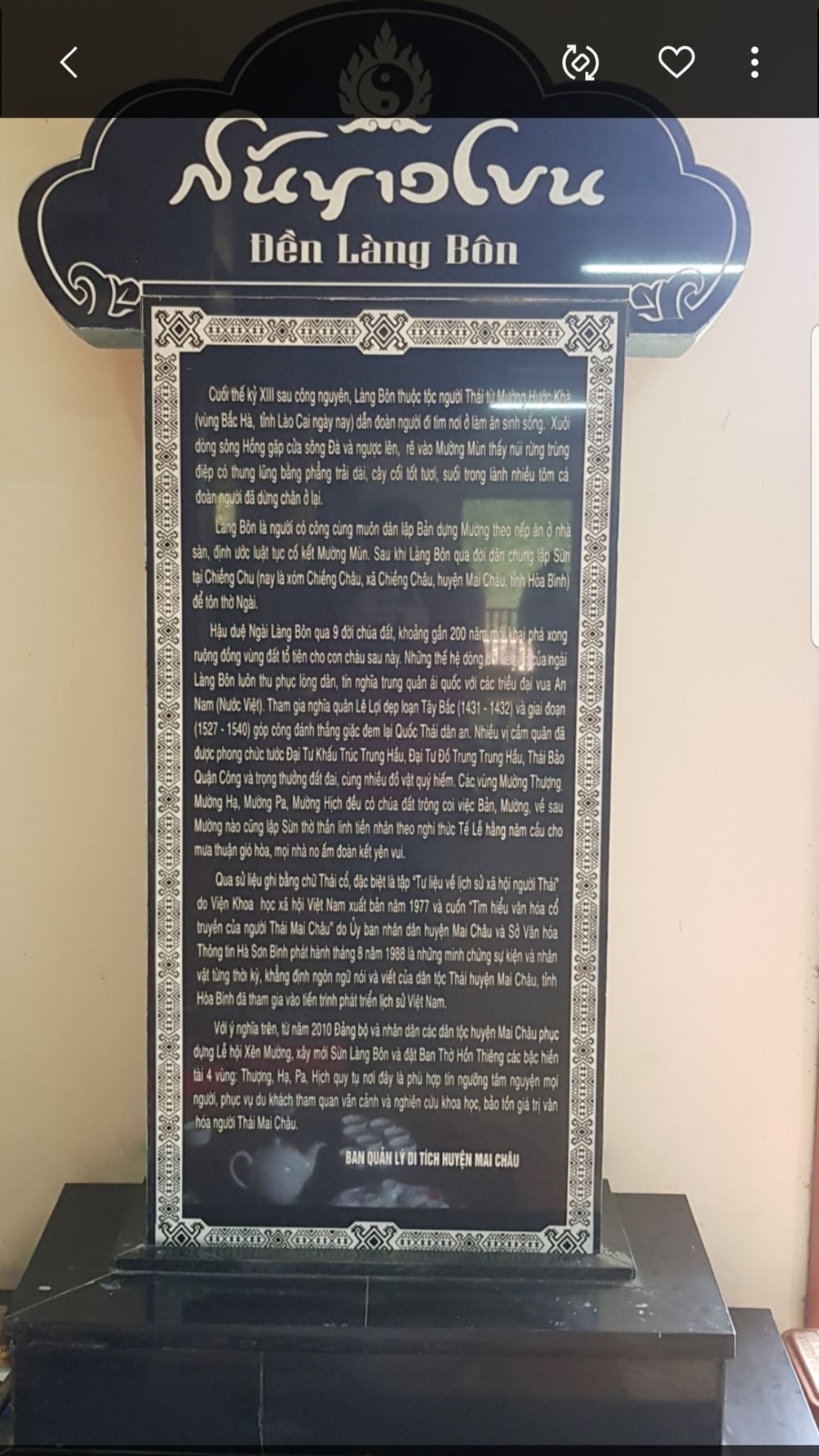 Храм Ланг Бон является не только священным местом, но и миниатюрным музеем, где хранятся ценные экспонаты уникальной культуры народности Тхай. Благодаря своим архитектурным, историческим и культурным ценностям, этот храм является одним из символов уезда Майтяу провинции Хоабинь.
