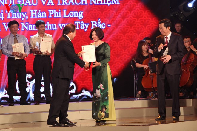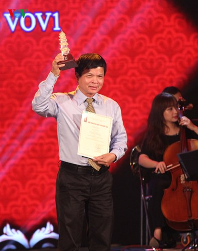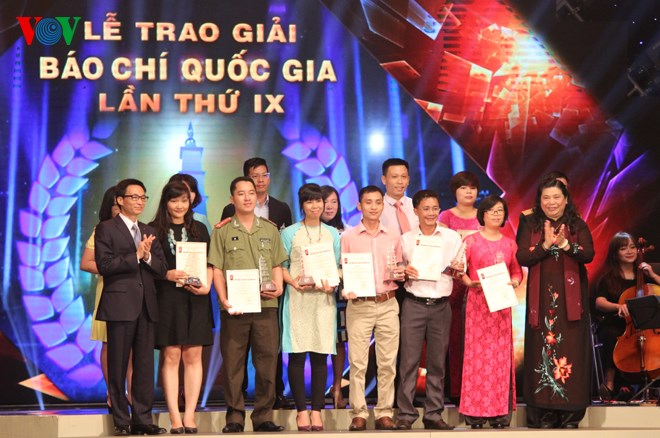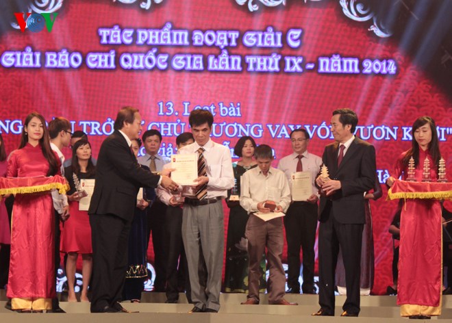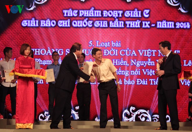 (VOV) - В воскресенье вечером в Ханое прошла 9-я церемония вручения премий победителям национального конкурса на лучшие журналистские произведения 2014 года в связи с 90-летием Дня вьетнамской революционной прессы (21 июня). В церемонии приняли участие президент Вьетнама Чыонг Тан Шанг, бывшие главы Компартии Вьетнама Ле Кха Фиеу и Нонг Дык Мань, высшие руководители Компартии, Государства и Правительства Вьетнама, представители министерств и ведомств, а также большое количество журналистов со всей страны.