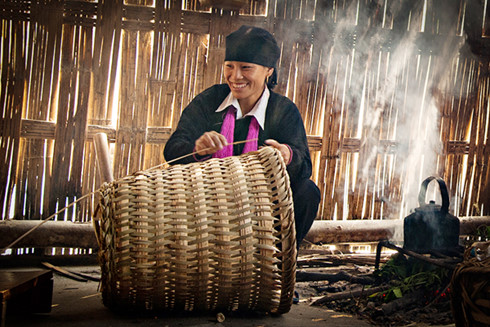 Женщина народности Зяи в городе Лаокай и домотканные изделия.