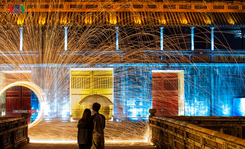 | Императорский дворец при династии Нгуен в ночное время. Его верхняя часть носит название «Павильон Нгу Фунг» или «Павильон Пяти Фениксов», где с балюстрады наблюдали за парадами, оглашали приказы и зачитывали лунный календарь. |