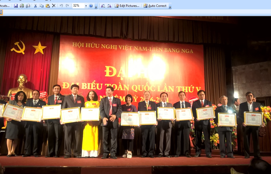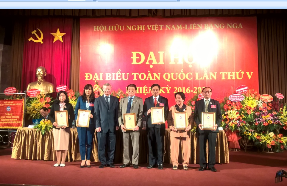 | Глава Общества российско-вьетнамской дружбы вручает частным лицам и коллективам ОВРД удостоверения к почетному знаку Общества за большой вклад в дело развития и укрепления дружбы и сотрудничества между народами России и Вьетнама |