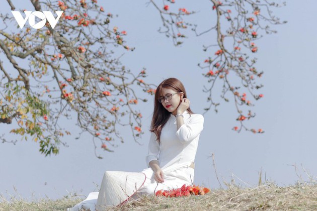 Девушки любят фотографироваться с цветами красного хлопкового дерева. Фото: Dang Giang.
