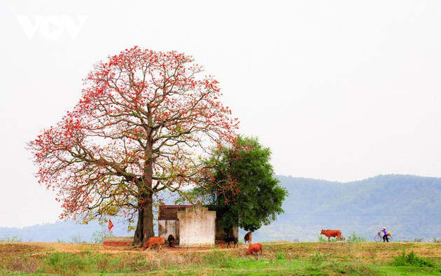 Красное хлопковое дерево - украшение романтической картины общины Лангшон на фоне реки Туонг. Фото: Dang Giang.