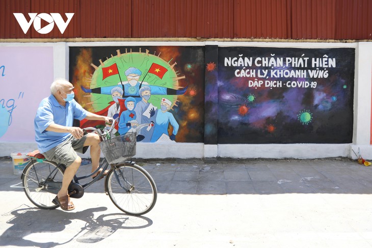 Улица Вучонгхань с граффити, нарисованные на тему борьбы с коронавирусом, находится в ханойском районе Хадонг.