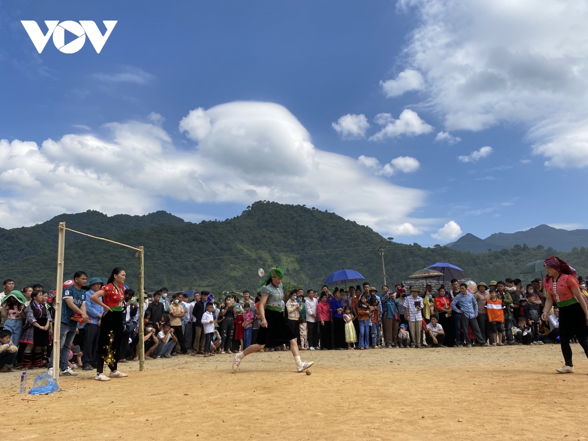 At the communal yard, various cultural activities and folk games are held jubilantly, including a young rice pounding competition, throwing Pa Pao ball, football, picking fruit, an ethnic culinary competition, arranging trays of worship offering, and a trade fair of local products.