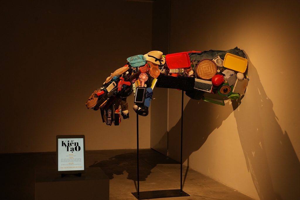 Tran Minh Tuan, a resident of Hanoi, said, “I’m quite impressed by the artwork called ‘Kien tao (Construction), which uses cassettes, air-con controllers, and mobile phones to form an outstretched arm, reflecting the development of society and reaching the pinnacle of technology, but people can still reuse old things.”