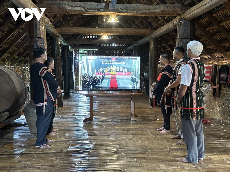 Ede people in Ako Dhong hamlet, Buon Ma Thuot city, Dak Lak province, gather at the house of the village chief to watch the live broadcast of the funeral of General Secretary Nguyen Phu Trong. (photo: VOV) |