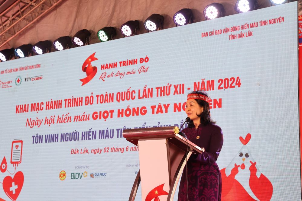Ms. Bui Thi Hoa, Standing Deputy Head of the National Steering Committee for Voluntary Blood Donation Campaign and President of the Vietnam Red Cross Society speaks at the launch of the Red Journey 2024 |