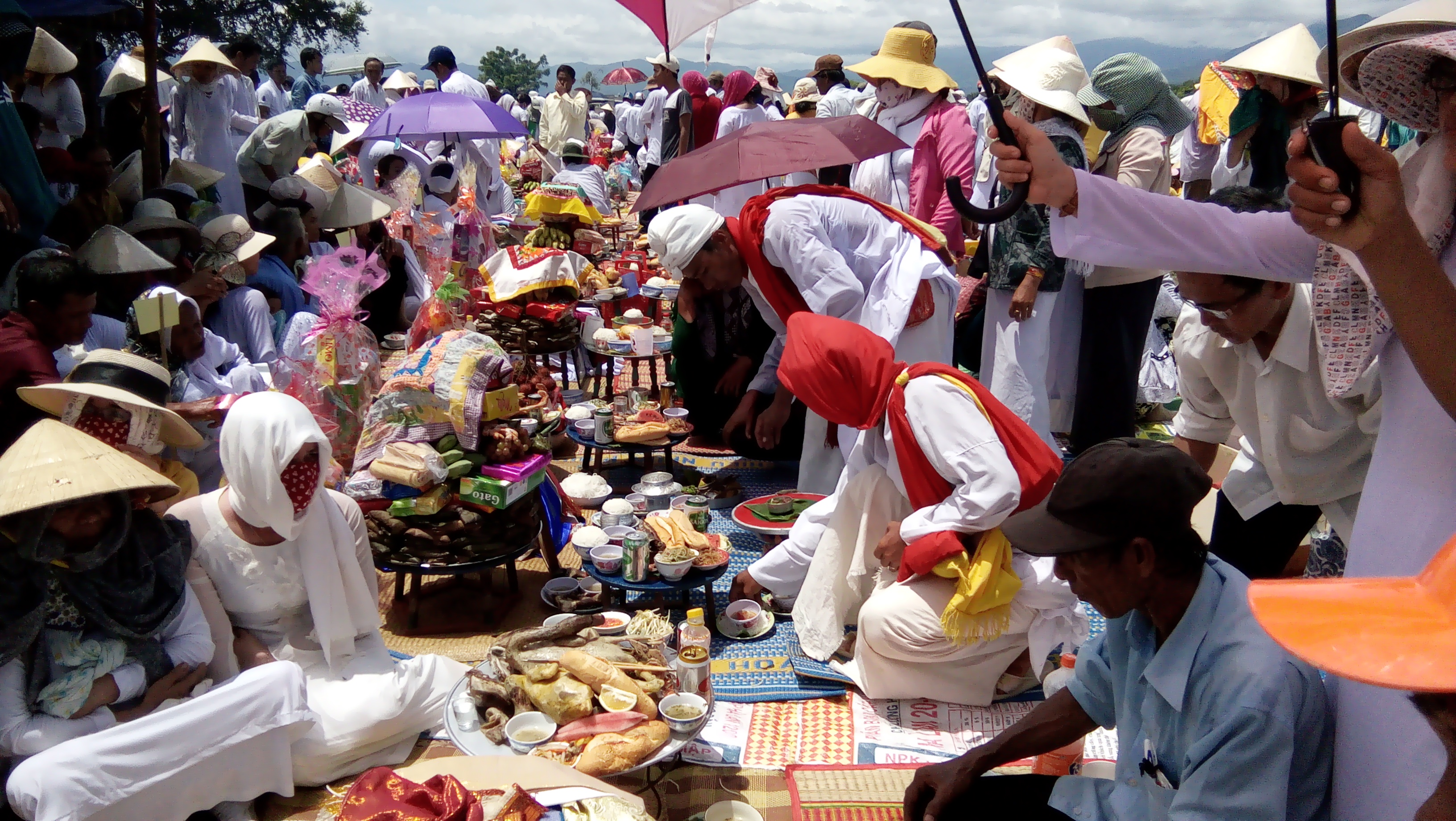 The Cham Balamon or Ba Cham funeral recapitulates the process of human birth. The first day of a person’s life until his last day is represented by the pregnancy, and the day of cremation represents the day of birth. The Ba Cham people believe that from the first day of the funeral the deceased is no longer dead. Doctor Truong Van Mon, an expert on Cham culture said: “The Ba Cham people consider the funeral tent a symbol of a woman in the process of giving birth. The dead body is the newborn child. On the second pillar of the cemetery house, there is a wooden penis and an accompanying hole, symbolizing a vagina. These represent fertility. The death of a person is thought to serve the prosperity of his or her offspring and is the beginning of a new life.”