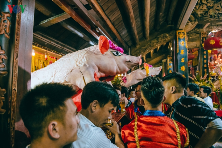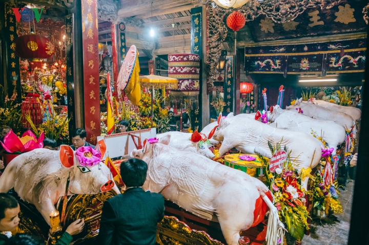 Nguyen Phan Dich, head of the festival’s organizing board, said: “Our village’s tutelary god was a talented general who defeated Chinese invaders. He was invincible in our hearts. In the village communal house, we prepare 6 trays of pork as an offering.”