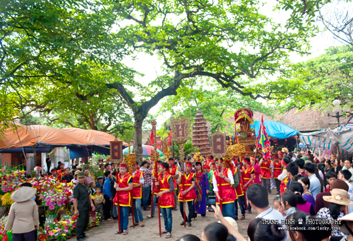 In the early morning of the festival, villagers bring the dummies to the temple to perform a series of rituals including the incense offering. Hundreds of people join a procession which is led by dragon dancers, followed by those carrying flags, female dancers and villagers in the traditional long dress ao dai.