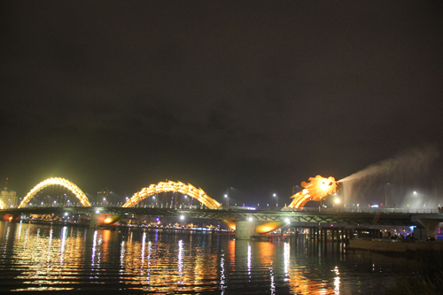 สะพานมังกรพ่นไฟพ่นน้ำในคืนส่งท้ายปีเก่าต้อนรับปีใหม่ |