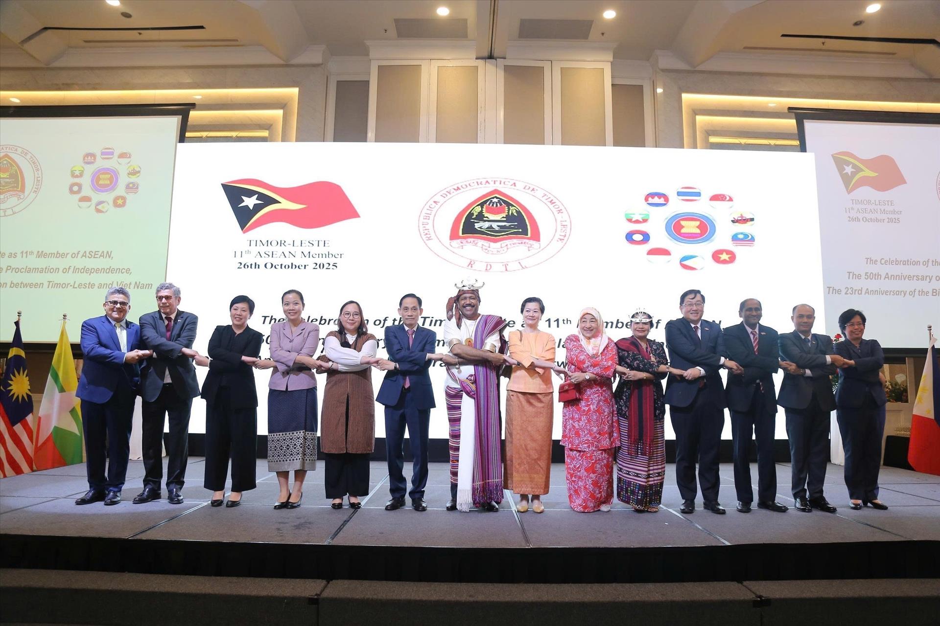 เมื่อค่ำวันที่ 3 พฤศจิกายน ณ กรุงฮานอย สถานทูตติมอร์เลสเตประจำเวียดนามได้จัดงานฉลอง 50 ปีวันประกาศเอกราช 28 พฤศจิกายน และ 23 ปีการสถาปนาความสัมพันธ์ทางการทูตกับเวียดนาม 28 กรกฎาคม ฉลองการที่ติมอร์เลสเตได้เข้าเป็นสมาชิกลำดับที่ 11 ของอาเซียน ในการกล่าวปราศรัยในงาน นาย เลหว่ายจุง รัฐมนตรีว่าการกระทรวงการต่างประเทศเวียดนามได้เผยว่า เวียดนามจะเปิดสถานทูต ณ ติมอร์เลสเตโดยเร็วเพื่อเป็นสะพานเชื่อมกระชับความร่วมมือระหว่างสองประเทศให้แน่นแฟ้นยิ่งขึ้น พร้อมทั้งกล่าวอวยพรเนื่องในโอกาสที่ติมอร์เลสเตเป็นสมาชิกของอาเซียนและแสดงความเชื่อมั่นว่า การเข้าร่วมของติมอร์เลสเตจะมีส่วนร่วมเพิ่มพลังให้แก่อาเซียน ส่งเสริมความสามัคคีและยกระดับสถานะของอาเซียนบนเวทีโลก เวียดนามให้คำมั่นที่จะร่วมมือกับบรรดาประเทศอาเซียนเพิ่มการประสานงานและช่วยเหลือติมอร์เลสเตให้บรรลุเงื่อนไขต่างๆ ในกระบวนการเป็นสมาชิกอาเซียนอย่างเป็นทางการและแก้ไขปัญหาที่เกิดขึ้นในกระบวนการผสมผสานอย่างมีประสิทธิภาพ