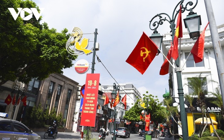 | ในโอกาสรำลึกครบรอบ 78 ปีการปฏิวัติเดือนสิงหาคม 19 สิงหาคมและวันชาติ 2 กันยายน ถนนสายหลักต่างๆ สำนักงานและสถานที่สาธารณะต่างๆ ในกรุงฮานอยได้รับการตกแต่งด้วยโปสเตอร์ |