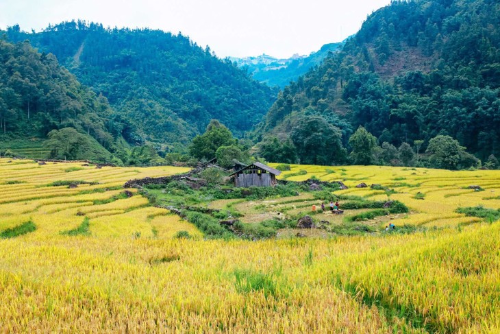 ภาพทุ่งนาเหลืองอร่ามที่ล้อมรอบด้วยภูเขาสูงตระหง่านสร้างความประทับใจให้กับนักท่องเที่ยวเป็นอย่างมาก (VOV)