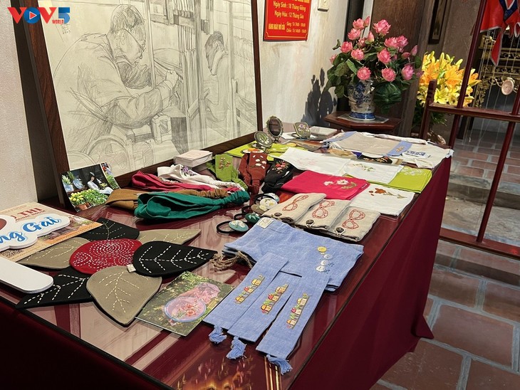ที่วิหารดิ่งตู๊ มีการจัดแสดงภาพผ้าไหมเย็บปักถักร้อยโดยฝีมือของช่างศิลป์จากหมูบ้านเย็บปักถักร้อยก๊วดด๊ง |