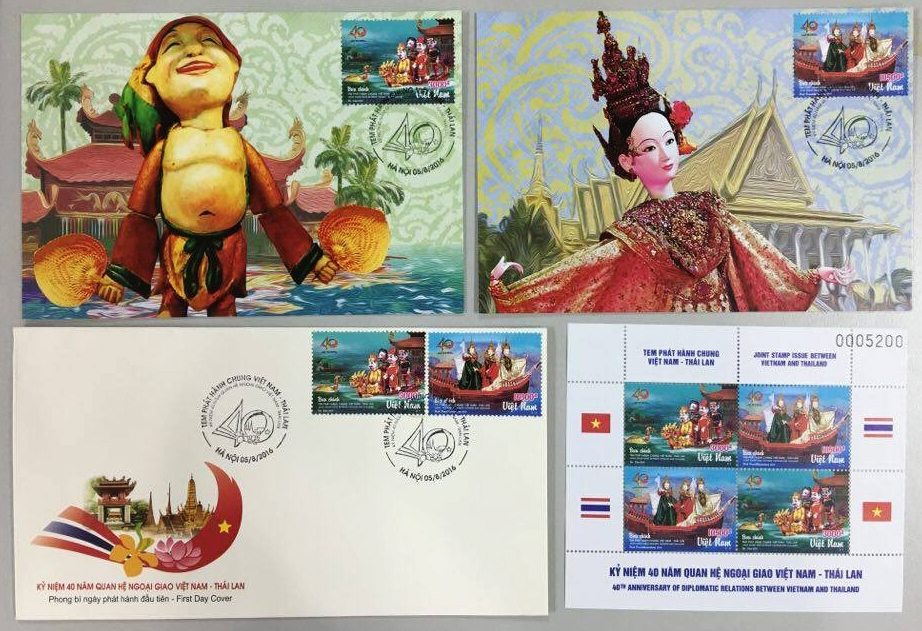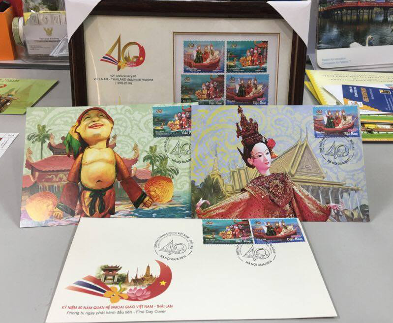 (VOVworld) – เนื่องในโอกาสฉลองครบรอบ 40 ปีการสถาปนาความสัมพันธ์ทางการทูตระหว่างเวียดนามกับไทย ซึ่งตรงกับวันที่ 6 สิงหาคม เมื่อเช้าวันที่ 5 สิงหาคม กระทรวงสื่อสารและประชาสัมพันธ์ได้ประสานกับกลุ่มบริษัทไปรษณีย์จัดพิธีเปิดตัวดวงตราไปรษณียากรเวียดนาม-ไทย ณ กรุงฮานอย ประเทศเวียดนามและกรุงเทพฯ ประเทศไทย โดยจัดแสดงสแตมป์ 2 ชุดภายใต้หัวข้อ “หุ้นกระบอก” ซึ่งเป็นศิลปะพื้นเมืองของไทยและเวียดนาม