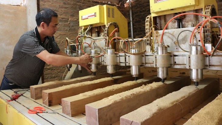 นาย เหงวียนวันมิงห์ รองผู้อำนวยการสหกรณ์แกะสลักไม้ บ๋ายโอ๋ย กำลังควบคุมเครื่องเครื่องเจาะอัตโนมัติ (ภาพจาก Báo Bắc Giang) |