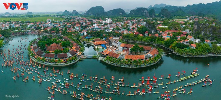 ผู้มาเยือนจะมีโอกาสได้เที่ยวชมแม่น้ำ โงด่ง ที่คดเคี้ยวตามนาข้าวสีทองสองฝั่งและล้อมรอบด้วยภูเขา ซึ่งเป็นภาพที่สวยงามและมีเสน่ห์ (ภาพจาก Minh Hải) |
