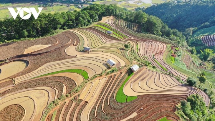 ภาพ “คลื่นน้ำ” บนทุ่งนาขั้นบันไดในอำเภอหมู่กางฉายจากมุมสูง (ภาพจาก CTV A Lù/VOV)
