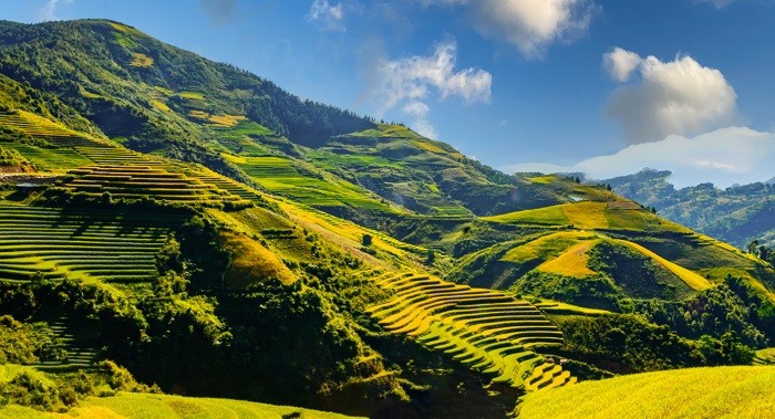 ทุ่งนาข้าวเหลืองทองอร่ามที่โอบกอดภูเขาหินปูนสร้างภาพทิวทัศน์อันสวยงามที่หาชมได้ยาก ซึ่งได้ดึงดูดนักท่องเที่ยวเดินทางมาเป็นจำนวนมาก (ภาพจาก dulichdienbien.vn) |