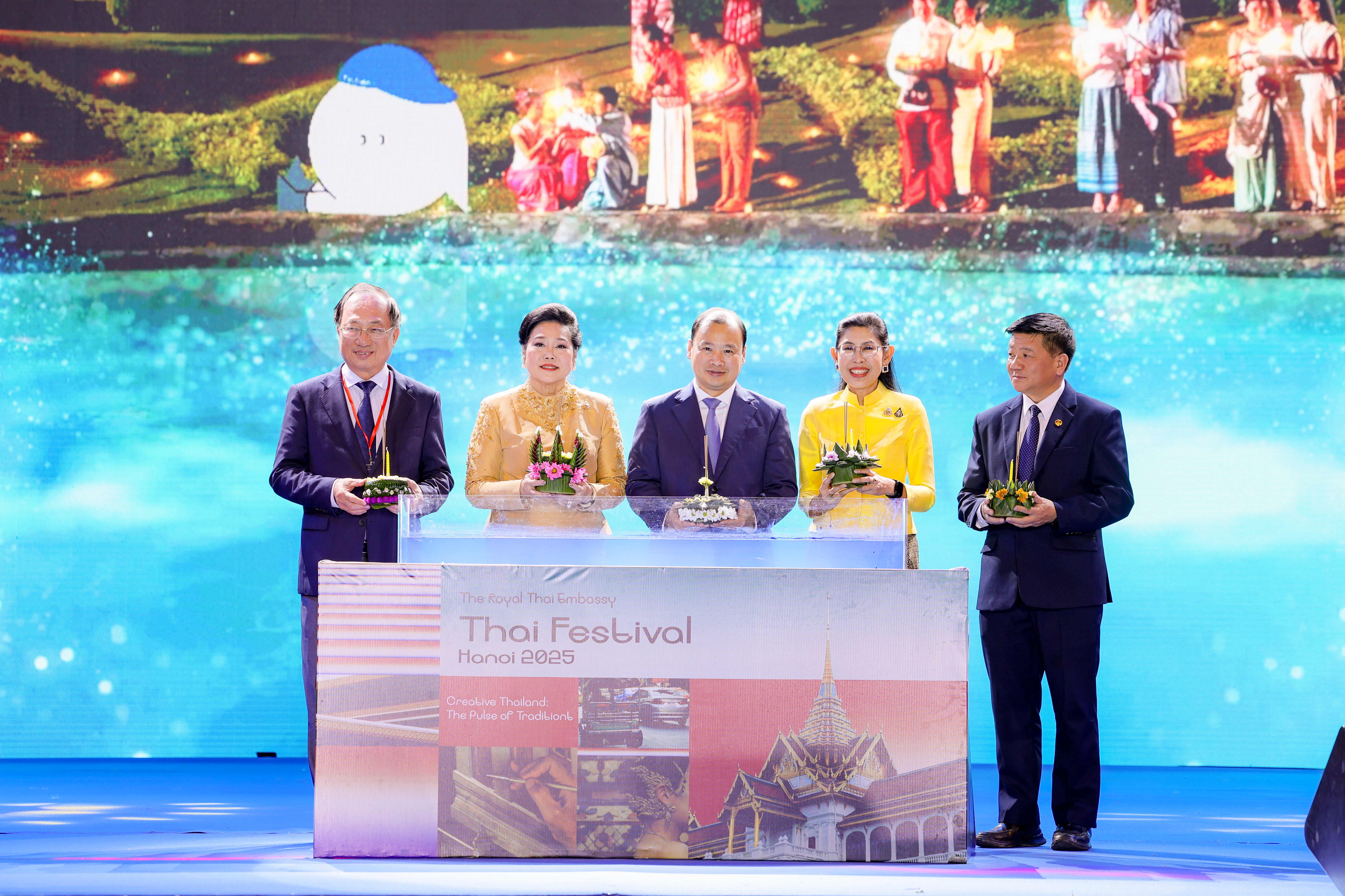 นาย เลหายบิ่งห์ รัฐมนตรีช่วยว่าการกระทรวงวัฒนธรรม การกีฬาและการท่องเที่ยวเวียดนาม (กลาง) ผู้แทนฝ่ายเวียดนาม ร่วมพิธีลอยกระทรงกับนาง ลาลีวรรณ กาญจนจารี ผู้ช่วยรัฐมนตรีประจำกระทรวงการต่างประเทศไทย และนางสาว อุรวดี ศรีภิรมย์ เอกอัครราชทูตไทย ณ กรุงฮานอย |