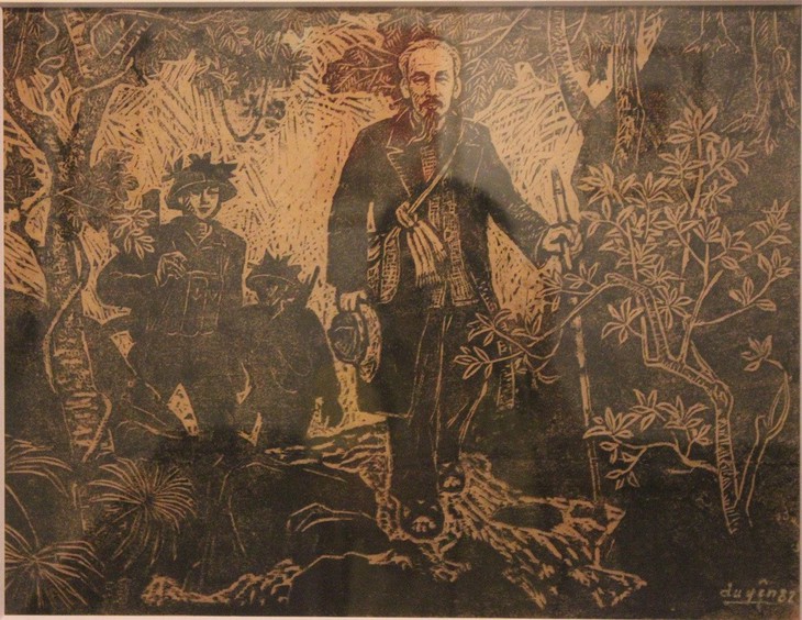 ประธานโฮจิมนห์ทำงานในสำนักงานของรัฐบาลภาคเหนือ จิตรกร โตหงอกเวิน วัสดุ: ไม้แกะสลัก : ปี 1946 |
