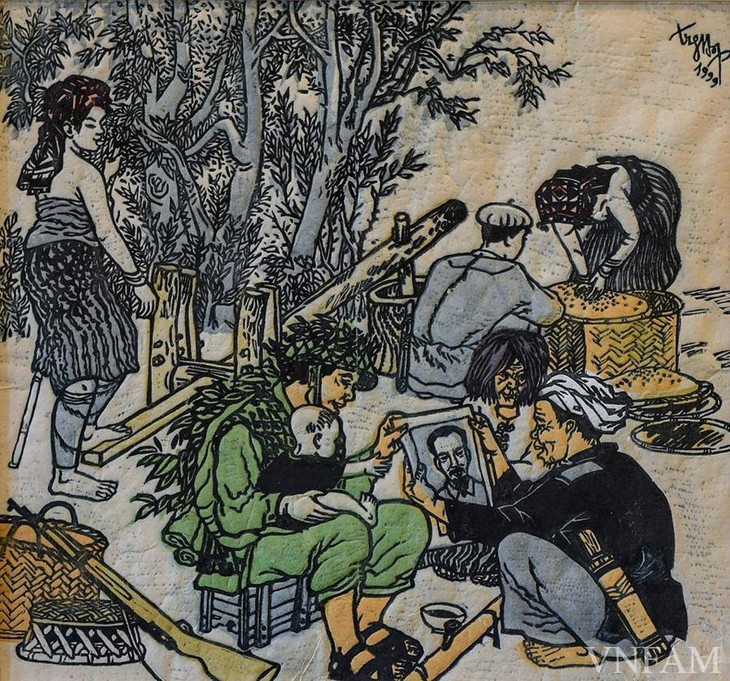 ฉลองวันคล้ายวันเกิดของประธานโฮจิมินห์ในเขตชาญเมือง – ภาพวาดสีน้ำของจิตรกร เหงียนแทงโจวเมื่อปี 1973 |