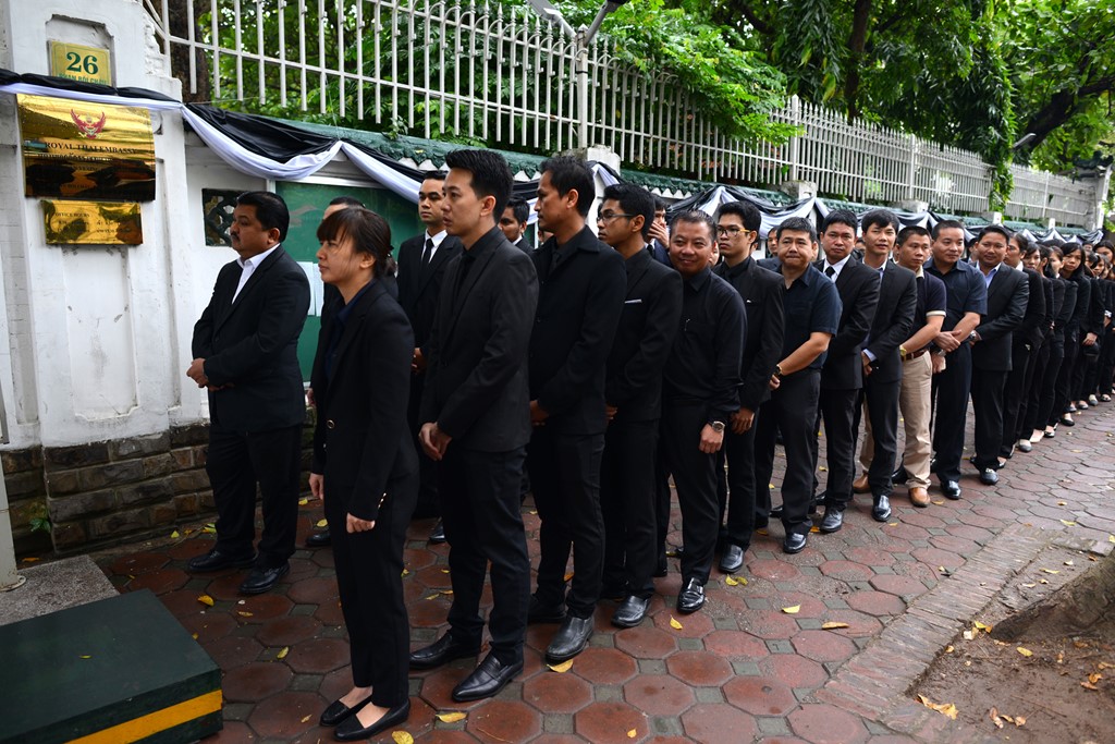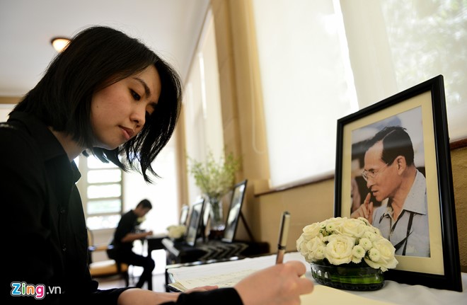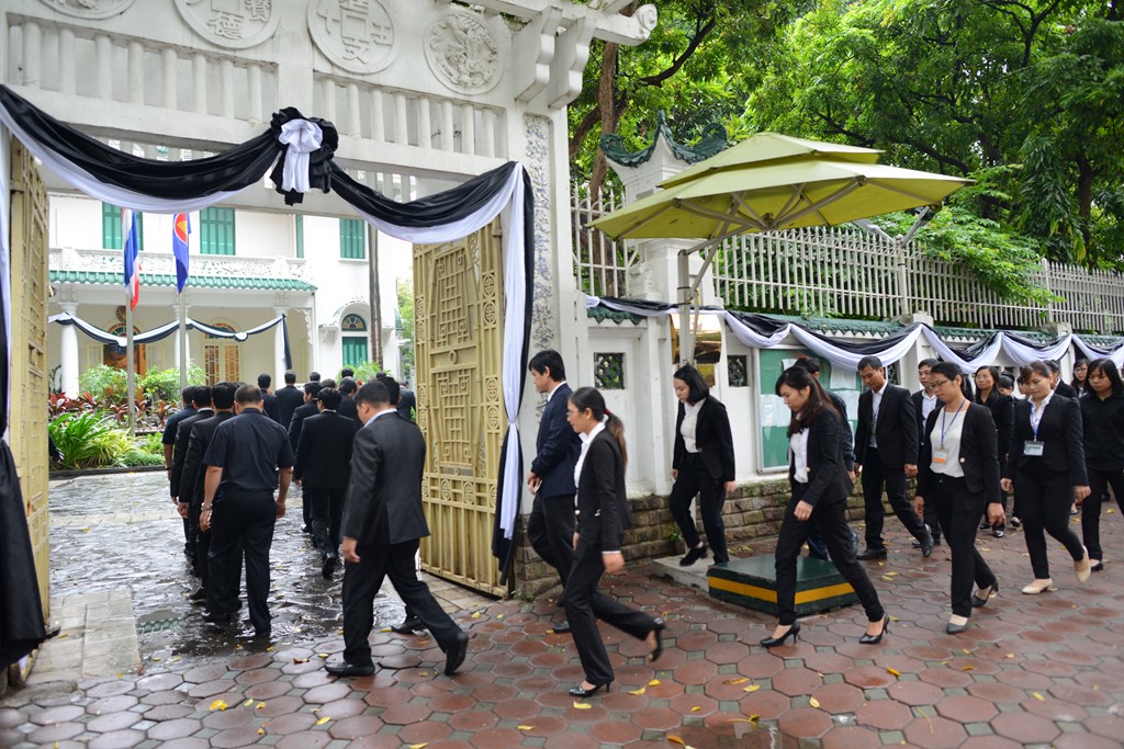 ![]() ประชาชนชาวไทยและชาวเวียดนามนับร้อยคนได้เข้าแถวด้านหน้าสถานทูตไทยประจำกรุงฮานอยรอเข้าไว้อาลัยพระบาทสมเด็จพระเจ้าอยู่หัวฯ