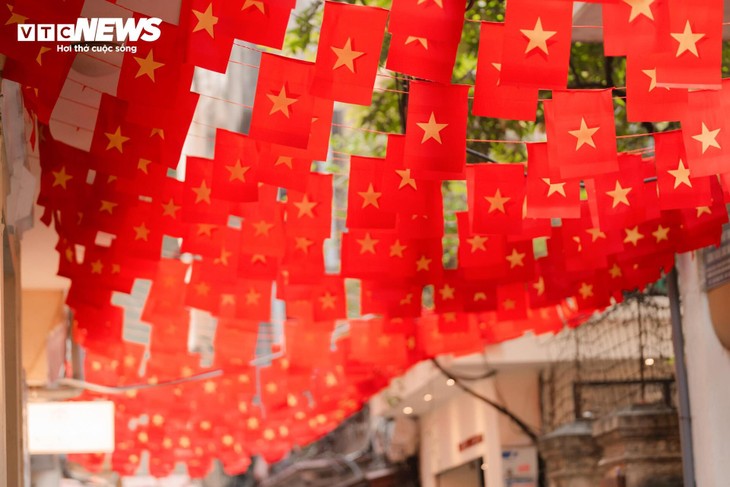 สีแดงของธงชาติและธงพรรคคอมมิวนิสต์เวียดนามตามเส้นถนนหลัก เช่น จ่างเตี่ยน เดี่ยนเบียนฝู และตามตรอกซอกซอยต่าง ๆ สร้างบรรยากาศที่เต็มไปด้วยความศักดิ์สิทธิ์และภาคภูมิใจต่อประเทศชาติ |