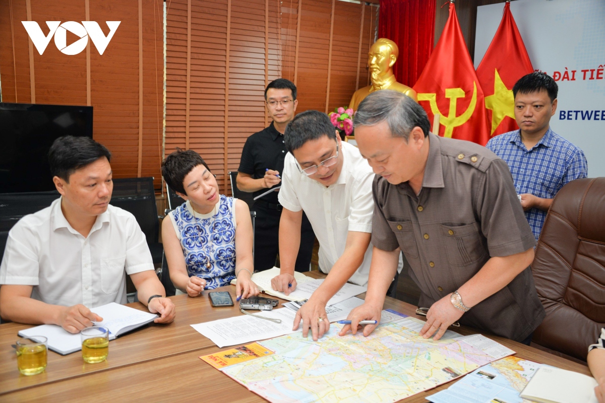 Tổng Giám đốc Đỗ Tiến Sỹ (bìa phải) kiểm tra các phương án và kế hoạch tường thuật trực tiếp và các phương án bố trí ê-kip, phóng viên trên các tuyến đường của Ban Thời sự VOV1. Ảnh: VOV |